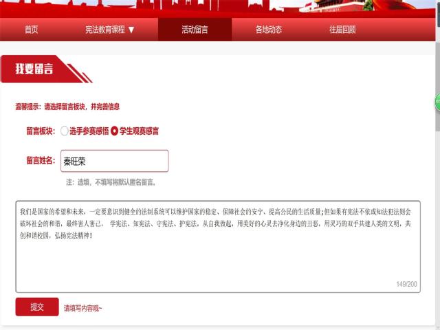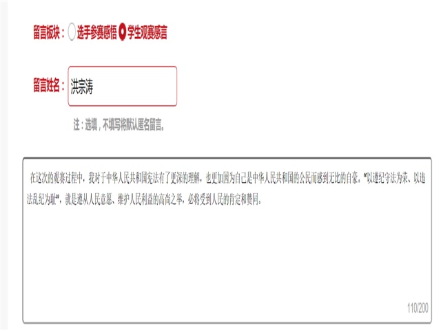活动当天,计软网安院组织学生以不同形式观看了“学宪法讲宪法”节目,并面向全院征集“我眼中的宪法”征文进行评比。计算机学科楼报告厅、宿舍、教室、图书馆,不同的地方,不同的人,都怀着同样热忱的心情在竞赛节目中学习、感悟着宪法。参与征文评比的同学们以文抒怀,表达了自己对宪法的深入理解,将宪法、国家和个人相结合,明确了宪法是根本法,具有最高的法律效力。他们坚信社会各阶层的人民学法、知法、守法、用法能够约束自我,也能保障自己的权益,维护社会法治安全,避免各类悲剧的发生。同学们从不同的角度出发,深入剖析节目中和生活中的法律案例,用一笔一划共书法之严谨。最终三名同学的征文脱颖而出,获得优胜。