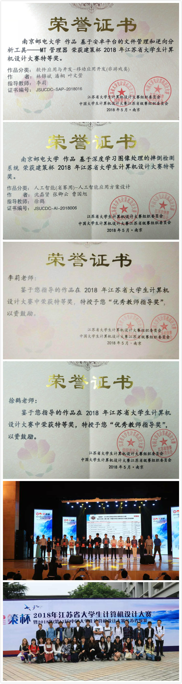 2018年江苏省大学生计算机设计竞赛(简称竞赛)落下帷幕,yl23455永利官网学子有两组选手荣获特等奖,两个一等奖与一个二等奖。其中来自yl23455永利官网的李莉与徐鹤老师荣获竞赛优秀老师指导奖。