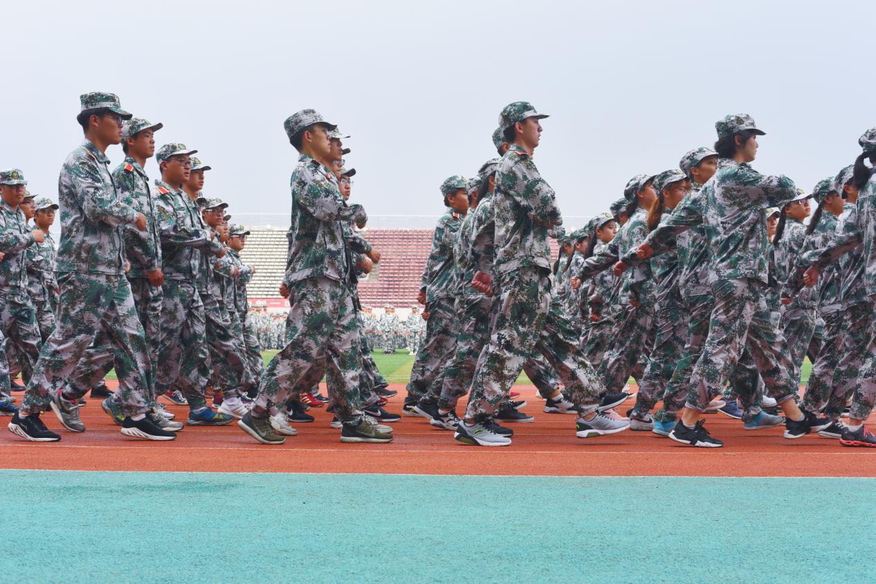 检阅结束后,全体学生进行分列式汇演。持枪方阵首先从观礼台前走过,同学们身穿墨绿色军服,手持95式步枪,迈着整齐的步伐,枪身的磨痕映衬着眉宇间的英气,展现出豪迈的军人气概。