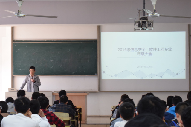 2018年10月26日下午两点,yl23455永利官网、软件学院、网络空间安全学院2016级信息安全、软件工程(与NIIT合作嵌入式培养)和软件工程(嵌入式培养)专业在教3-409召开了本学期第一次年级大会,会议由新任辅导员杨健老师主持。