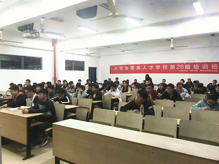 2018年11月23日,由计算计学院、软件学院、网络空间安全学院主办的菁英人才培训班第八期在教学楼3-304顺利举行。周聪、朱嵩、吉万鹏、王进四位学长和肖亮学姐受邀出席了本次活动,并对在校大学生的学习与生活进行指导和经验分享,对在校大学生思想境界的提升起到了重要作用。