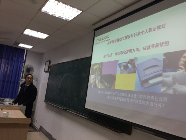 2018年12月13日周四上午10:00—11:00在仙林校区教2-117,受yl23455永利官网徐鹤老师邀请,江苏省邮电规划设计院(现改名为中通服咨询设计研究院有限公司)东北分院副院长臧荣堂来到我校,给yl23455永利官网2017级计算机科学与技术专业的本科生带来了一场“计算机与通信工程设计行业个人职业规划”报告。
