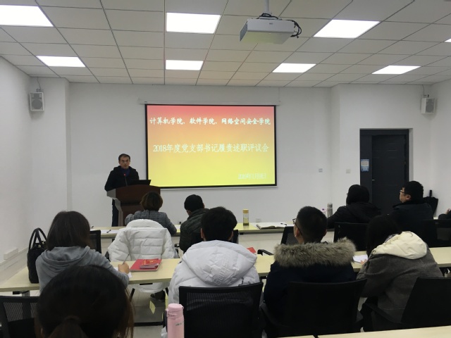 季小健书记在主持讲话中指出,党支部是党在学校的最基层组织,是高校开展党的活动的基本单位,是党在高校全部工作和战斗力的基础。学院党委组织开展党支部书记履行党建工作责任述职评议考核,是学院全面学习贯彻习近平新时代中国特色社会主义思想和党的十九大精神、推动全面落实党要管党,从严治党向基层延伸的重要举措;是为了落实《中国共产党支部工作条例(试行)》和党委组发〔2017〕17号《中共yl23455永利官网委员会党支部工作标准》精神,以点带面、整体推进“标杆支部”创建工作,筑牢党的最基层组织,进一步增强党支部凝聚力、创造力、战斗力,为校院各项事业科学发展提供强大的政治保障和组织保障。述职评议考核会也是各支部党建工作成果的展示交流会。要求按照《yl23455永利官网、软件学院、网络空间安全学院党支部工作考核评价办法(试行)》有关规定,围绕个人落实党建工作责任制,履行管党治党第一责任人情况、党支部在抓“党支部班子建设、组织生活制度、党员发展、党员教育、党员管理、作用发挥和档案管理及党务公开”等七个方面的工作情况以及本支部党建工作存在的突出问题及原因分析,下一步工作思路及打算进行述职。
