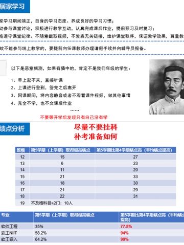在学风建设方面,吴忧老师对各班和各专业的绩点进行了分析,罗列了上学期取得最高绩点和平均绩点提高的相关数据,其中软件工程(嵌入式培养)专业和软件工程(与NIIT合作嵌入式培养)专业平均绩点提高人数均在90%以上,肯定了同学们的努力和进步。接着,吴忧老师向同学们展示了学院大一学生线上云自习和B170416班郭俊茹同学学习打卡的图片,强调居家学习期间端正学习态度和培养自主学习习惯的重要性,提醒需要补考的同学珍惜时间,认真复习。