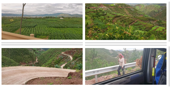 所幸那几日天气不错、沿途路况较好,随处可见山村好风景。我们小组行车数小时,从田野到群山之间,走过泥泞坡地、铺着石块的公路,所见风景从梯田到漫山果园,在山路上与牛群背向而过,在挂壁公路往下看到它紧贴山腰的下半程。一直驱车二三十公里才到达了第一家,这里的居民驻扎地稀稀落落,我们有时需要绕过一座山才来得到下一个家庭。