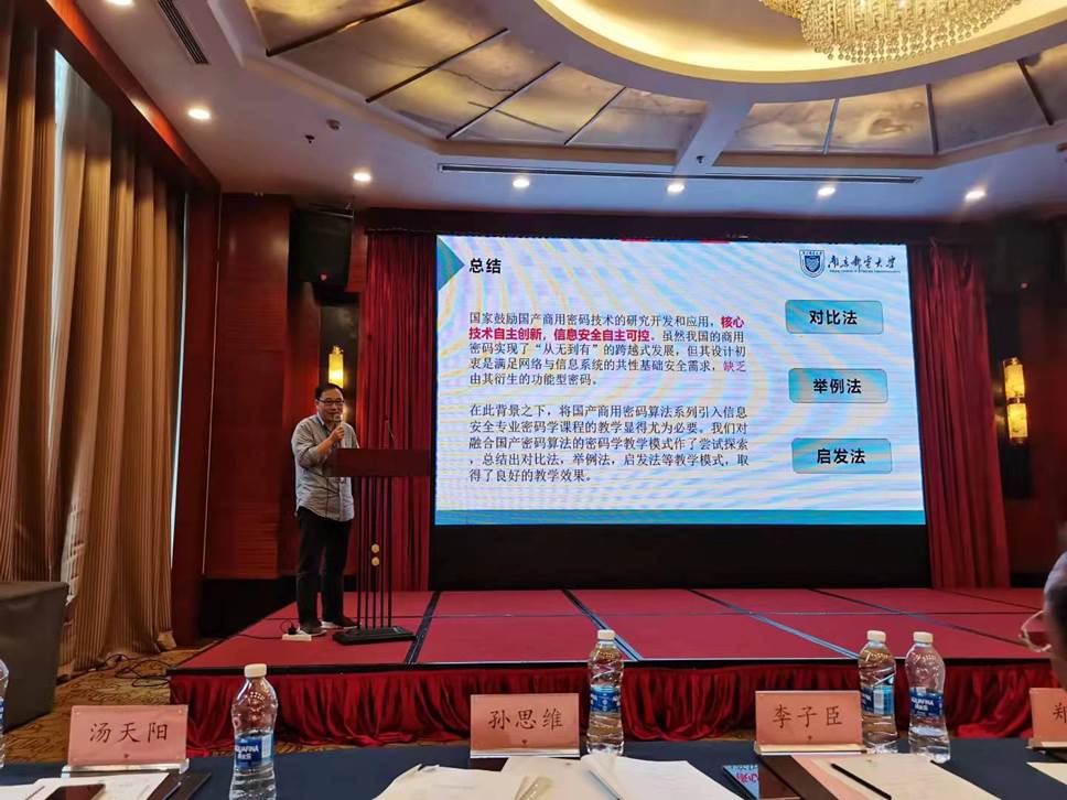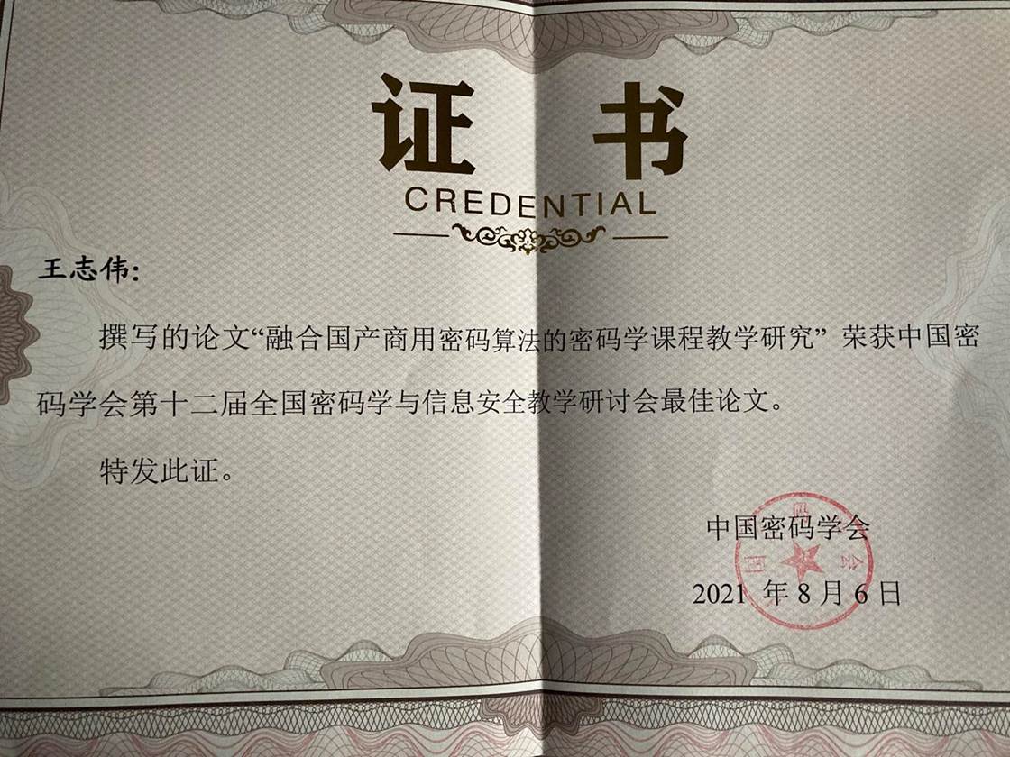 中国密码学会第十二届全国密码学与信息安全教学研讨会于2021年10月14-16日在重庆邮电大学召开。本次会议是由中国密码学会教育与科普工作委员会主办,由重庆邮电大学承办,西安邮电大学,深圳市纽创信安科技开发有限公司协办。研讨会由中国密码学会副理事长徐茂智教授致辞,有来自北京大学,中国科学院大学,西安电子科技大学,南开大学等高校专家作特邀报告。yl23455永利官网教师王志伟老师撰写的《融合国产商用密码算法的密码学课程教学研究》论文荣获第十二届全国密码学与信息安全教学研讨会最佳论文奖。王志伟老师应邀作论文报告,并与其他国内从事网络空间安全领域教学科研工作的专家学者,就我国密码学和信息安全专业的教学教育改革、教材建设、专业建设、学科建设、产学研结合等一流专业、一流学科建设问题展开了深入交流。
