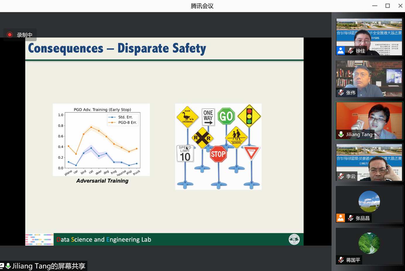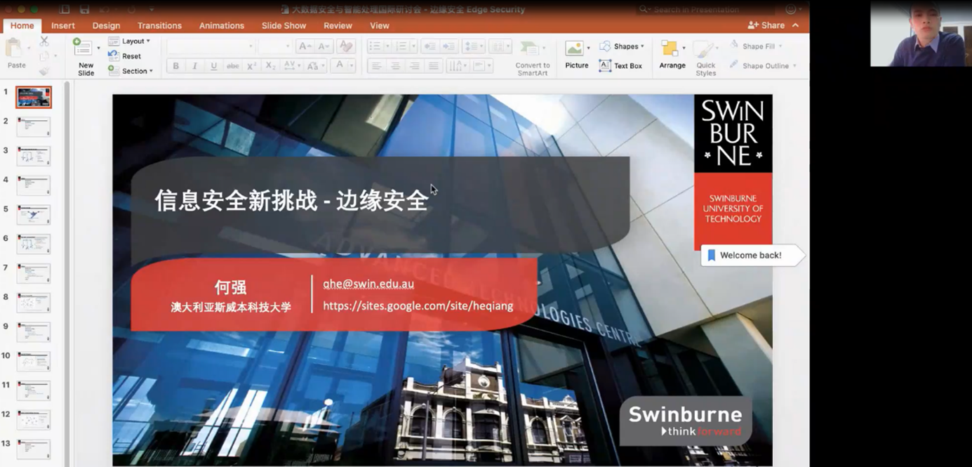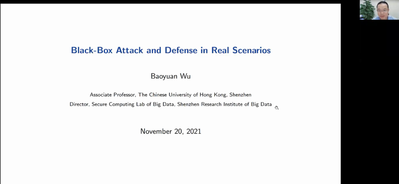 在随后的学术报告环节,美国密西根州立大学汤继良副教授、内布拉斯加大学林肯分校张宽助理教授、中新赛克安全创新中心总经理孙浩、星环信息科技资深技术总监杨洪山、南京理工大学周永彬教授、中国电信安全首席专家王爱宝、香港中文大学(深圳)深圳市大数据研究院大数据安全计算实验室主任吴保元、暨南大学温金明教授、澳大利亚斯威本科技大学何强副教授等9位国内外大数据安全领域知名专家受邀分别作了“可信人工智能中的安全性和公平性可以兼得吗?”、“Security in edge-assisted Internet of Things: Challenges and Solutions”、“构建数字化转型背景下的工业互联网安全保障体系”、“数据智能处理技术发展趋势及行业应用”、“一类计算型高阶掩码方案的安全脆弱性”、“数字经济时代安全技术发展趋势”、“现实场景下的黑盒对抗攻击与防御”、“格规约与格困难问题简介”、“边缘安全新挑战”的专题报告。针对参会代表感兴趣的话题,专家们通过网络进行了解答。线上会议讨论热烈,学术氛围浓厚,进一步加强了yl23455永利官网在大数据安全领域的对外合作交流。