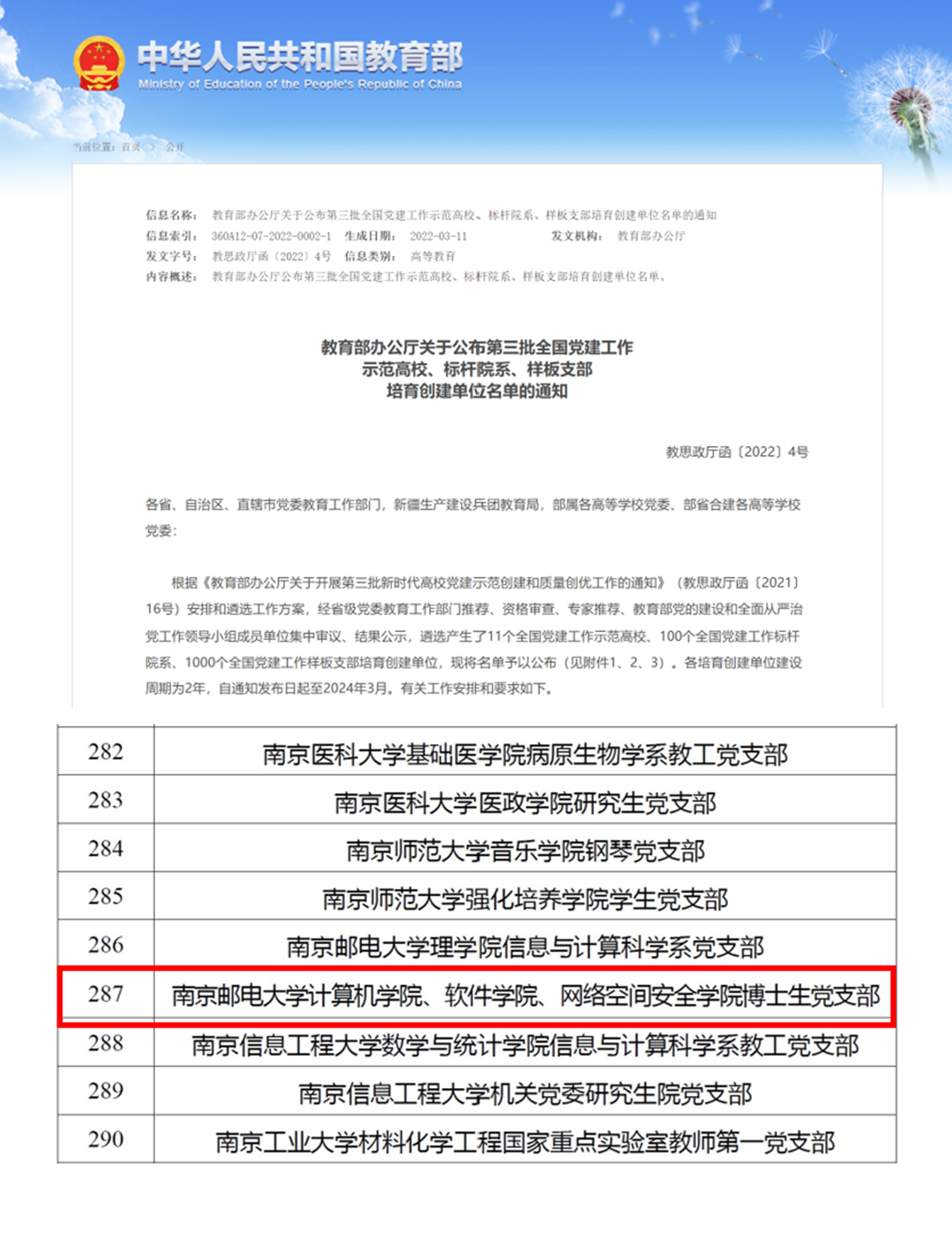 近日,教育部公布了第三批全国党建工作示范高校、标杆院系、样板支部培育创建单位名单,yl23455永利官网院、软件学院、网络空间安全学院博士生党支部(以下简称“博士生党支部”)入选“全国党建工作样板支部”。