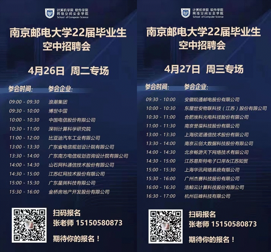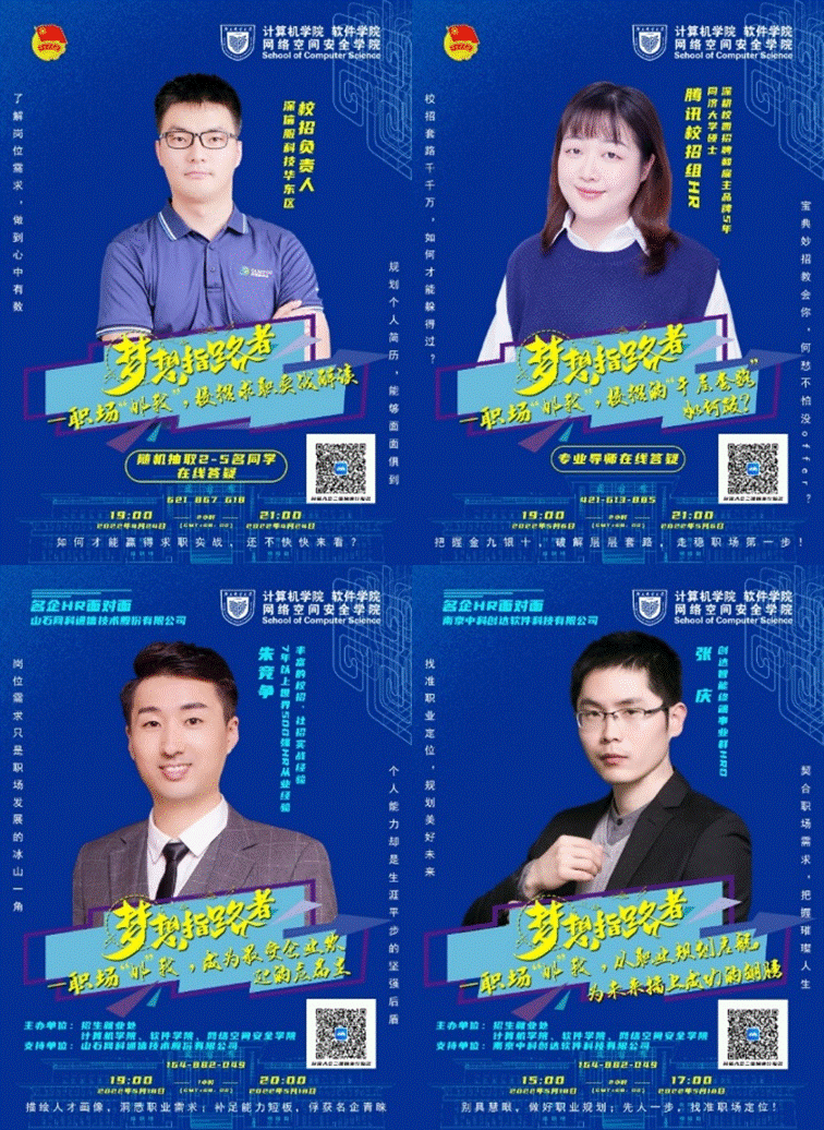 直播宣讲——毕业生专享的“高级定制”盛宴。“听了‘职场邮你’的线上直播,感觉对自己的就业目标更清晰了。”5月以来,在贴合行动主题“用人单位大走访 全员联动促就业”的基础上,由学院牵头,多家知名企业应邀加入,“梦想指路者——职场‘邮’我”系列宣讲会成功举办。深信服科技有限公司、腾讯科技有限公司、南京中科创达软件科技有限公司和山石网科通信技术有限公司负责招聘的4位HR老师与同学们在线交流,从DISC性格模型分析到高潜能技术类候选人能力模型,从员工的真实案例分析到履历优化策略,直播内容深入浅出,互动气氛热烈。