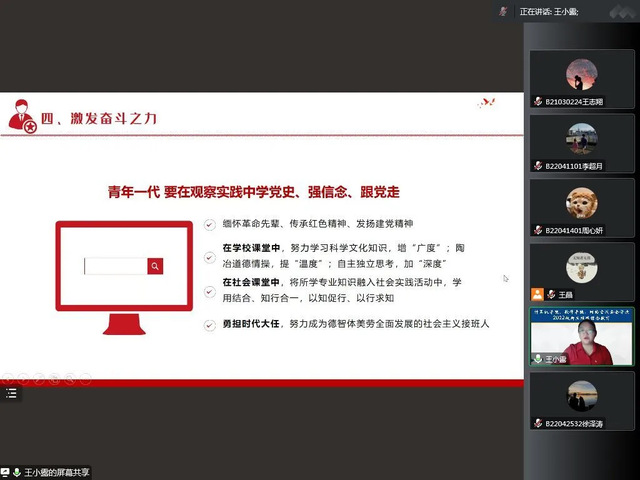 王小露书记首先通过红色经典歌曲、影视等素材引入主题,然后从“寻求理想信念之源”、“坚定理想信念之本”、“厚植理想信念之基”和“激发奋斗之力”四个部分带领大家重温党的光辉历程,追忆党的峥嵘岁月,讲述革命先辈的爱国事迹,从百年党史中感悟共产党人的精神品质。她谈到,“以史为鉴,可以知兴替”,要从“四史”学习实践中汲取智慧、继续前行的力量,缅怀革命先烈、感悟先辈初心、传承红色基因、实干砥砺前行,立鸿鹄志,做奋斗者,努力让青春之花在党和人民最需要的地方绽放。