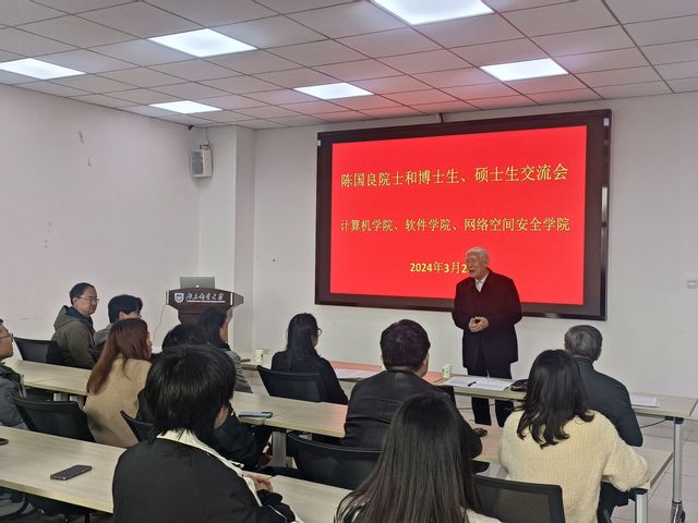 3月28日,yl23455永利官网、软件学院、网络空间安全学院举行科研心得分享会,中国科学院院士、首届国家级教学名师、yl23455永利官网教授陈国良在学科楼338会议室与在读博士和硕士研究生亲切交流,分享了自己多年来的教书育人和科研心得,学院副院长(主持工作)鲍秉坤教授、王汝传教授、何静教授、季一木教授、李鹏教授、徐鹤教授和部分学生代表出席了此次活动。