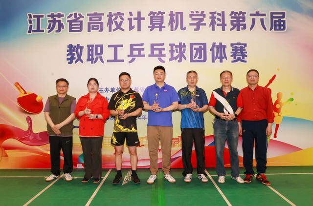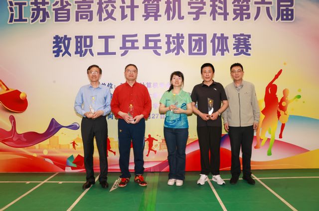 在乒乓球比赛期间,校党委副书记蒋国平,yl23455永利官网、软件学院、网络空间安全学院党委书记尹志丽亲临比赛现场,与大家共同见证这场体育盛事的精彩瞬间。经过一天紧张激烈而和谐有序的比赛,各队顽强拼搏,赛出了较高水平和良好风尚。最终南通大学代表队、金陵科技学院代表队、江苏大学代表队分获冠亚季军,宿迁学院代表队和省外联合代表队并列获得第四名,获得第五至第八名的代表队依次为南京信息工程大学、扬州大学、江苏第二师范学院和南京理工大学。赛事最后由江苏省计算机学会副理事长武港山、江苏省计算机学会秘书长金莹、赛事组委会主任陶先平、赛事组委会委员张功萱、赛事组委会委员王洪元、yl23455永利官网院、软件学院、网络空间安全学院党委副书记、副院长刘星分别为各获奖队颁发奖杯、奖牌和荣誉证书。