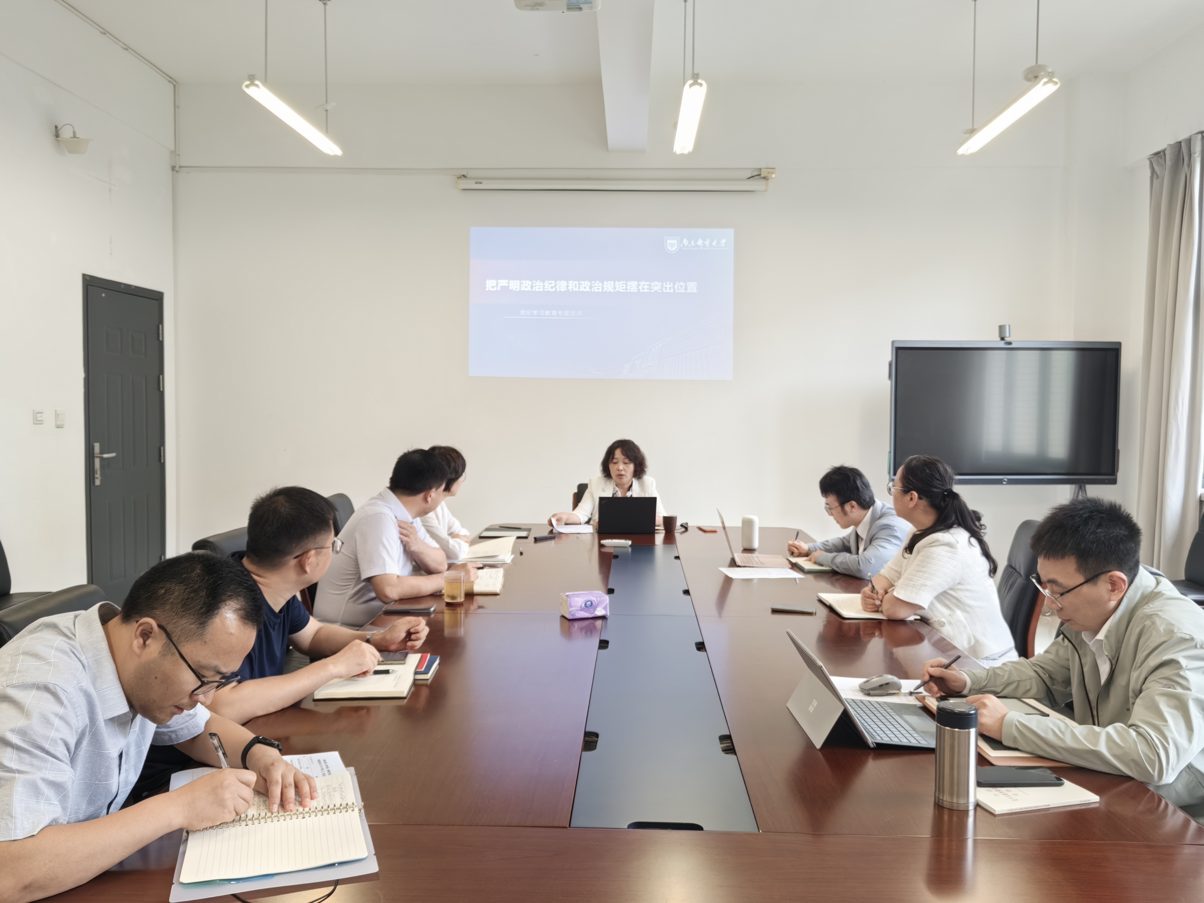 在“严明党的组织纪律 增强组织纪律性”环节,她再次领学了学院“三重一大”制度,解读了学院两个“议事规则”制度。她指出,全体党员干部要坚决落实组织制度,严格执行民主集中制、重大问题请示报告等规定,时刻将纪律和规矩挺在前面,真正做到心往一处想、劲往一处使,步调一致向前进。