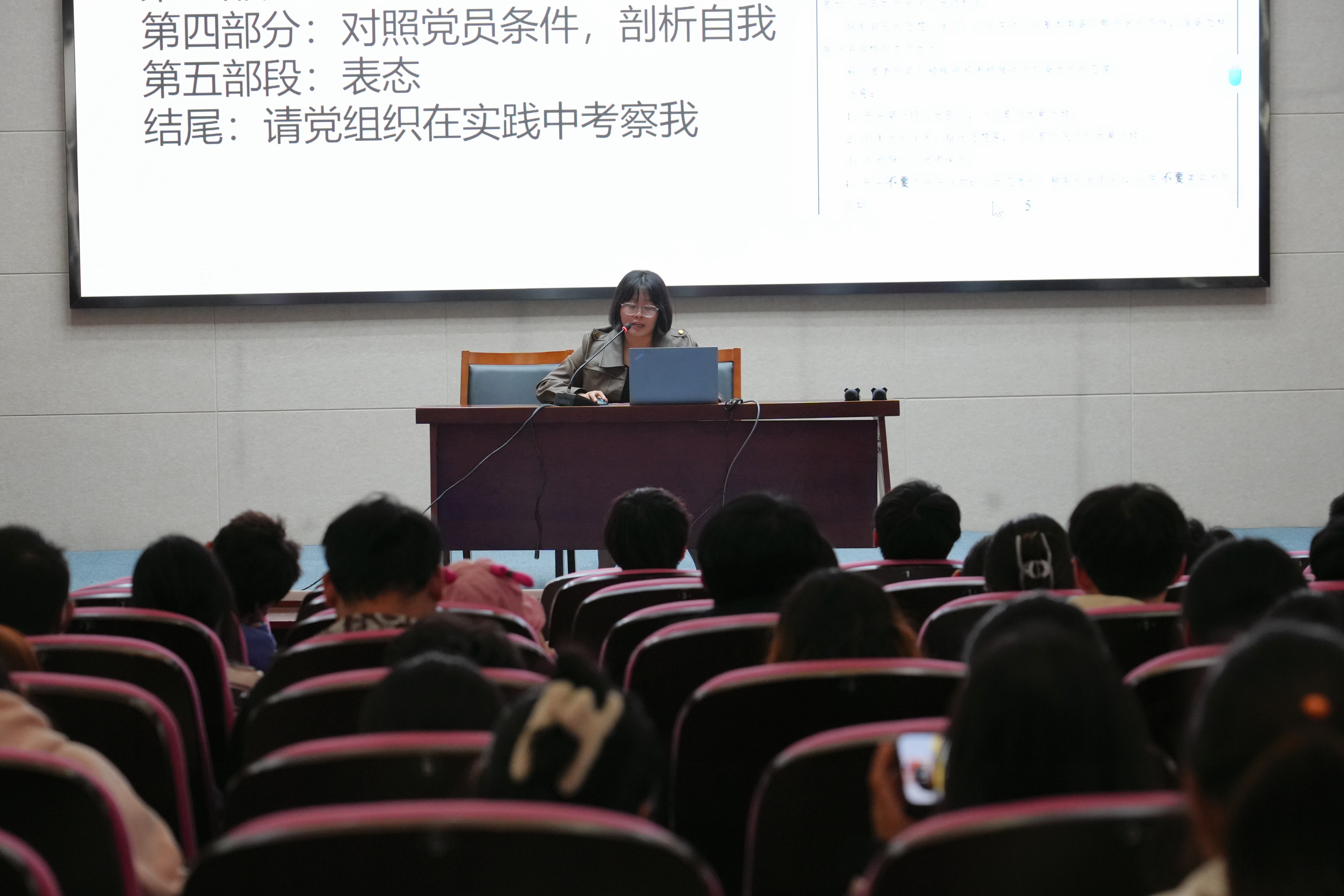 任老师在授课过程中,以严谨的态度和专业的精神,丰富生动的实际案例,对入党申请书的基本结构、思想汇报的撰写规范及内容要点进行了深入细致的阐释。特别是对党员发展不同阶段的材料撰写的标准格式进行了重点讲解,条理清晰地介绍了各项注意要点。