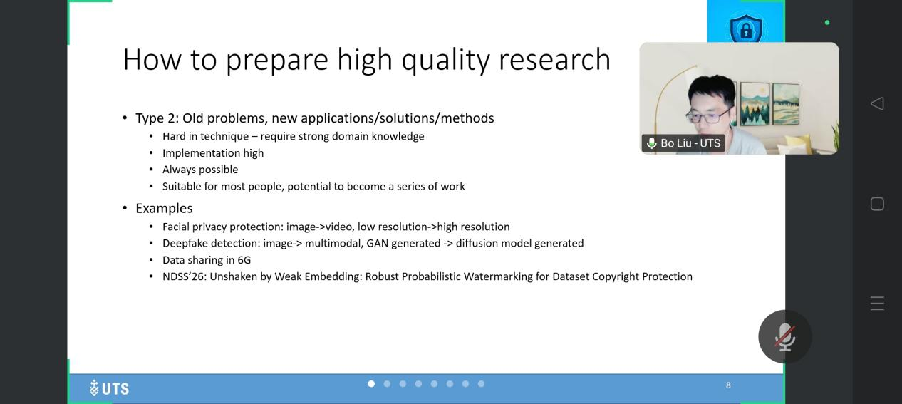 报告中,刘勃教授系统梳理了当前主流的数据安全研究进展,并重点分享了近年来备受关注的研究方向,包括数据与人工智能系统的安全与隐私保护、深度伪造测技术,以及人工智能模型的安全风险评估等前沿议题。此外,他还结合自身科研经验,就如何选题、凝练科学问题以及撰写高质量学术论文提出了切实可行的建议。报告结束后,刘勃教授与现场师生围绕“将已有方法应用于新场景是否具备创新性”“深度伪造检测的技术难点与评价标准”等问题与刘勃教授展开了深入交流。讨论气氛热烈,与会师生纷纷表示受益匪浅。