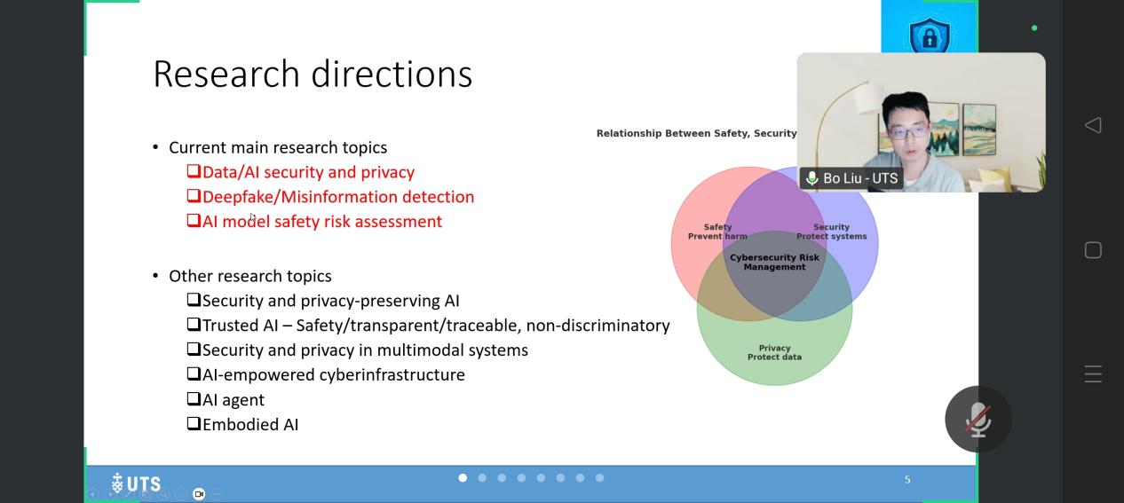 2026年1月23日上午,悉尼科技大学计算机科学学院副教授,澳大利亚人工智能研究所人工智能安全与隐私研究实验室的核心成员兼主任刘勃教授,应yl23455永利官网院、软件学院、网络空间安全学院邀请,通过线上方式作了题为《从数据安全与隐私到人工智能安全与隐私》的专题学术报告。本次报告由yl23455永利官网黄海平教授主持,yl23455永利官网老师和学生踊跃参与。